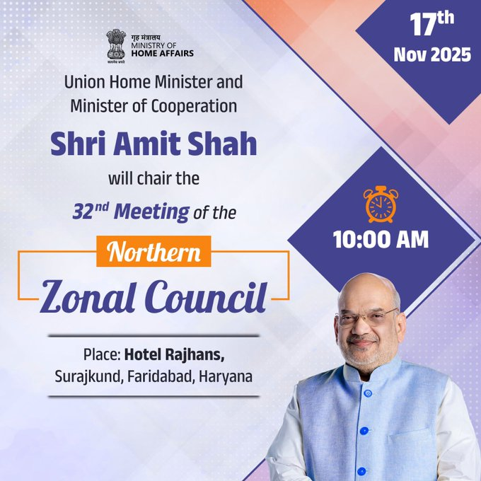 કેન્દ્રીય ગૃહમંત્રી અમિત શાહે આજે હરિયાણાના ફરીદાબાદ ખાતે ઉત્તરીય ઝોનલ કાઉન્સિલ (NZC)ની બેઠકની અધ્યક્ષતા કરી હતી. આ બેઠકમાં ઉત્તરીય ઝોનમાં આવતા રાજ્યો અને કેન્દ્રશાસિત પ્રદેશો — જેમાં હરિયાણા, હિમાચલ પ્રદેશ, પંજાબ, રાજસ્થાન, દિલ્હી, જમ્મુ અને કાશ્મીર, લદ્દાખ અને ચંદીગઢનો સમાવેશ થાય છે. આ ઝોનલ કાઉન્સિલનું મુખ્ય ધ્યાન કેન્દ્ર સરકાર, રાજ્ય સરકારો અને કેન્દ્રશાસિત પ્રદેશો વચ્ચેના સંકલનને મજબૂત કરવા પર હતું. બેઠક દરમિયાન, સભ્ય રાજ્યો વચ્ચેના મુખ્ય મુદ્દાઓ જેવા કે પાણીની વહેંચણીના વિવાદો, વિકાસ કાર્યોની પ્રગતિ અને પ્રાદેશિક સહકાર વધારવા પર વિસ્તૃત ચર્ચા કરવામાં આવી હતી. કેન્દ્ર સરકાર, રાજ્ય સરકારો અને કેન્દ્રશાસિત પ્રદેશોના વરિષ્ઠ અધિકારીઓએ આ મહત્ત્વપૂર્ણ બેઠકમાં હાજરી આપી હતી, જેનો ઉદ્દેશ સહકારી સંઘવાદના સિદ્ધાંતોને મજબૂત બનાવવાનો અને આંતર-રાજ્ય મુદ્દાઓના ઉકેલ દ્વારા પ્રાદેશિક વિકાસને વેગ આપવાનો છે.