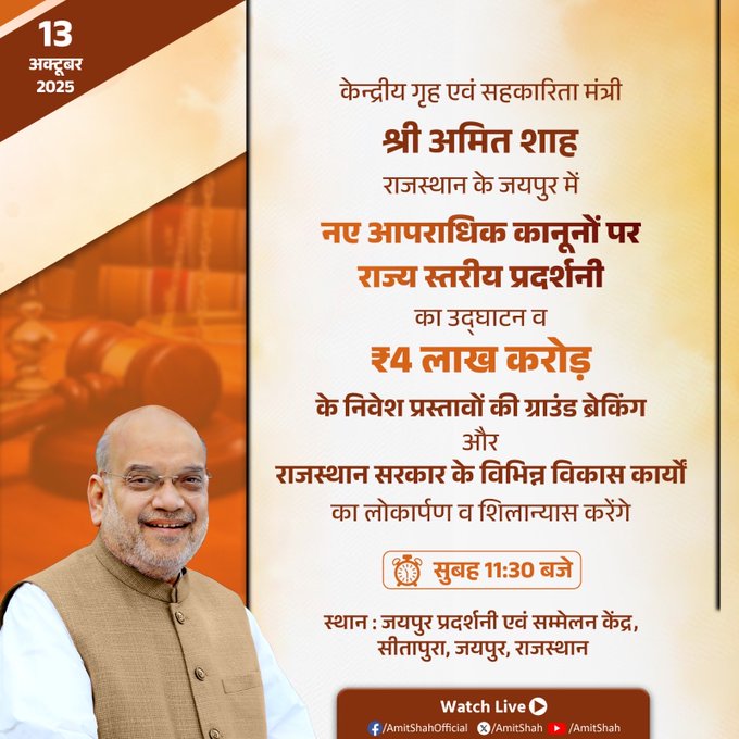 આજથી શરૂ થઈ રહેલા છ દિવસીય પ્રદર્શનમાં કાયદાઓની મુખ્ય જોગવાઈઓ પર પ્રકાશ પાડવામાં આવશે. શ્રી શાહ રાઇઝિંગ રાજસ્થાન ગ્લોબલ ઇન્વેસ્ટમેન્ટ સમિટ 2024 હેઠળ પ્રાપ્ત 4 લાખ કરોડ રૂપિયાના MOU હેઠળ શરૂ થનારા પ્રોજેક્ટ્સના શિલાન્યાસ સમારોહમાં ભાગ લેશે. શ્રી શાહ વિદ્યાર્થીઓના ગણવેશ માટે 260 કરોડ રૂપિયા અને ડેરી ઉત્પાદકોને દૂધ સબસિડી માટે 364 કરોડ રૂપિયા ટ્રાન્સફર કરશે.